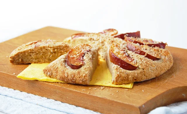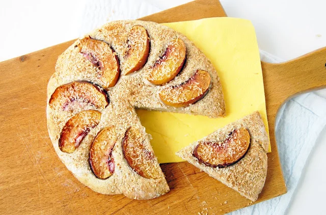 Keeping it simple for my first attempt I warmed things up with a cinnamon kick, added a touch of sweetness, some coconut and then simply pressed slices of nectarine into the surface prior to baking. It made for a lovely mid morning treat...like a modern twist on a tea bread (it would also make an awesome breakfast!). I think it could also benefit from even more fruit than shown in the photos, that is if you wanted more of a cakey and less bread-like treat.